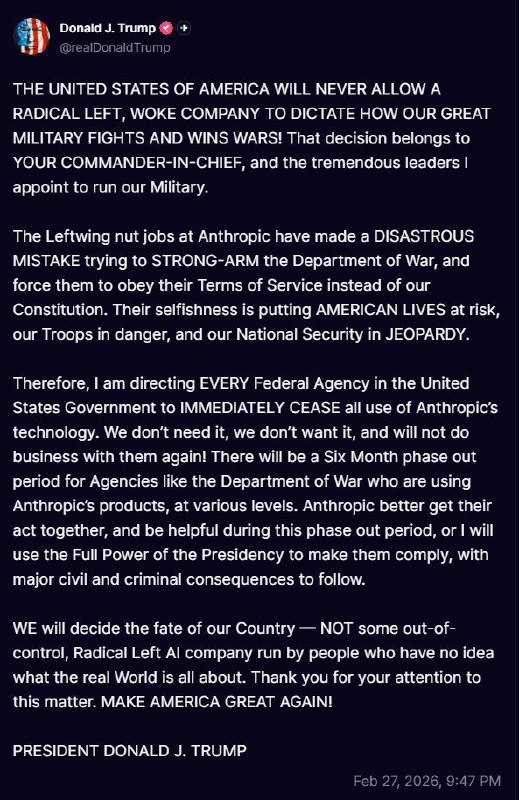 BREAKING: President Trump directs all federal agencies to cease use of Anthropic’s AI technology. 🔥 WHATSAPP CHANNEL 🔗 🚨 WHATSAPP GROUP 🔗 🇮🇱 TELEGRAM 🔗 🔗 FOLLOW ALL JBN LINKS: View Source