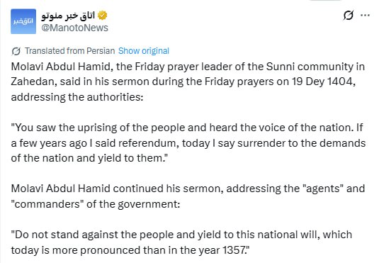 🚨🇮🇷 – NEW: Molavi Abdul Hamid, a prominent Iranian Baluchi/Sunni leader and Imam of Iran’s largest Sunni mosque, addressed authorities today: “You saw the uprising of the people and heard the voice of the nation. If a few years ago…