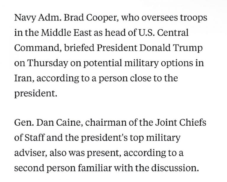 U.S. Central Command (CENTCOM) Commander Gen. Brad Cooper briefed President Donald Trump on Thursday regarding possible military options related to Iran, a source told ABC News. Chairman of the Joint Chiefs of Staff Gen. Dan Caine was also in attendance…