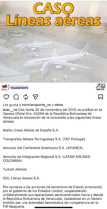 ⚠️🇻🇪🚫 ✈️ INAC announces the revocation of the concession to the airlines Iberia, Tap, Avianca, Turkish, Latam, and Gol for not resuming their flights to Venezuela View Source