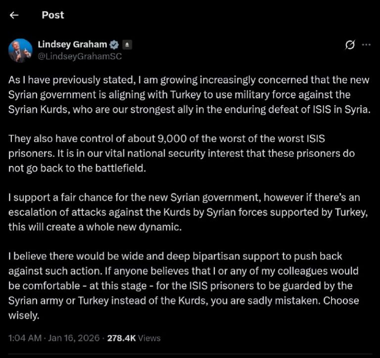 #BREAKING | 🇺🇸 🇸🇾 🇸🇾 🇹🇷 — U.S. Senator Lindsey Graham: As I have previously stated, I am growing increasingly concerned that the new Syrian government is aligning with Turkey to use military force against the Syrian Kurds, who are…