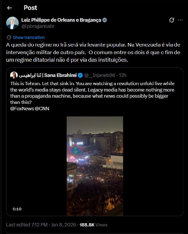 🇧🇷🤝👑🇻🇪 — Brazilian Federal Congressman and Imperial Prince Luiz Philippe de Orleans-Bragança commenting on Iranian protests and the Venezuelan events: The fall of the regime in Iran will be through a popular uprising. In Venezuela, it is through military intervention…