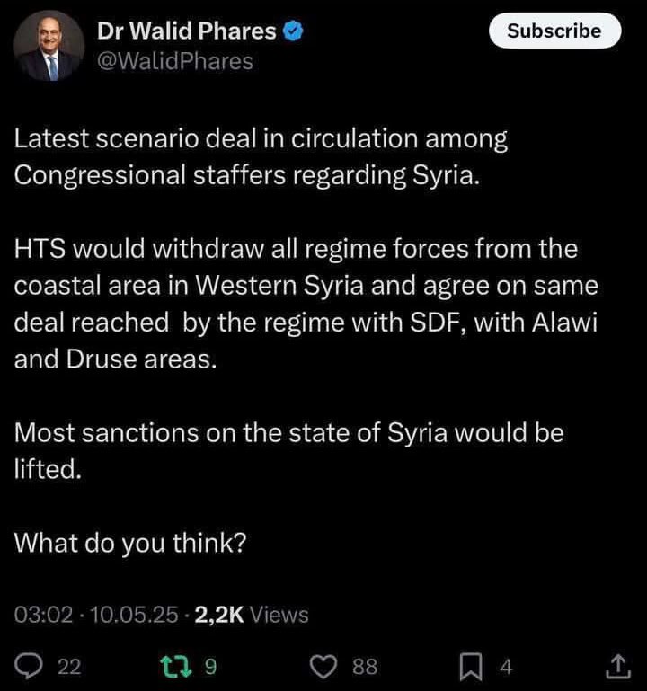 ⚡️🇺🇸 U.S. Adviser Walid al-Fares reports a new scenario circulating among U.S. congressional staffers regarding Syria: 📌 HTS would withdraw all its forces from western Syria’s coast in exchange for a deal with the Alawites and Druze, similar to the…