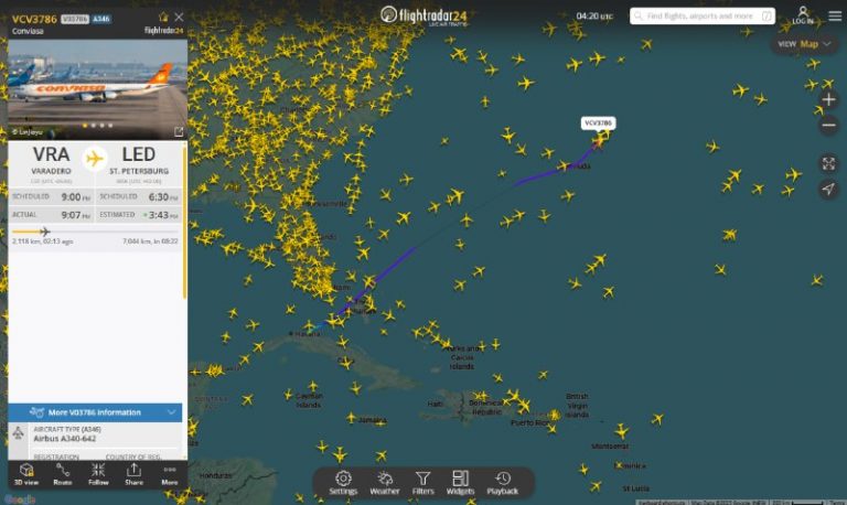 🇻🇪🇨🇺🇷🇺🗺 — Venezuela’s Conviasa Airbus A340-642 (VCV3786) spotted flying from Varadero International Airport to Saint Petersburg, Russian Federation View Source