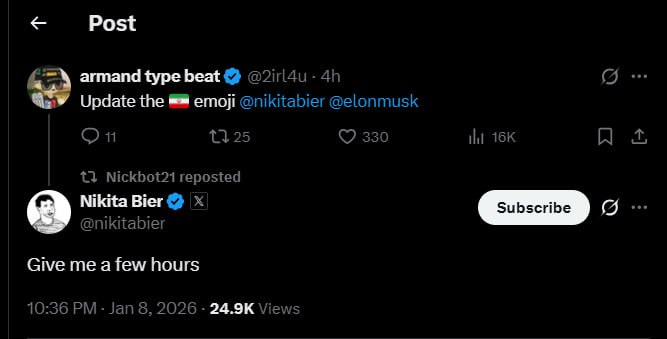 ❌🤝👑👑 — At request of Iranian monarchists, Twitter/X devs announces that he is changing the flag of Iran on Twitter from the Islamic Republic Version 🇮🇷 to the Lion and Sun 👑 (Monarchist flag) View Source