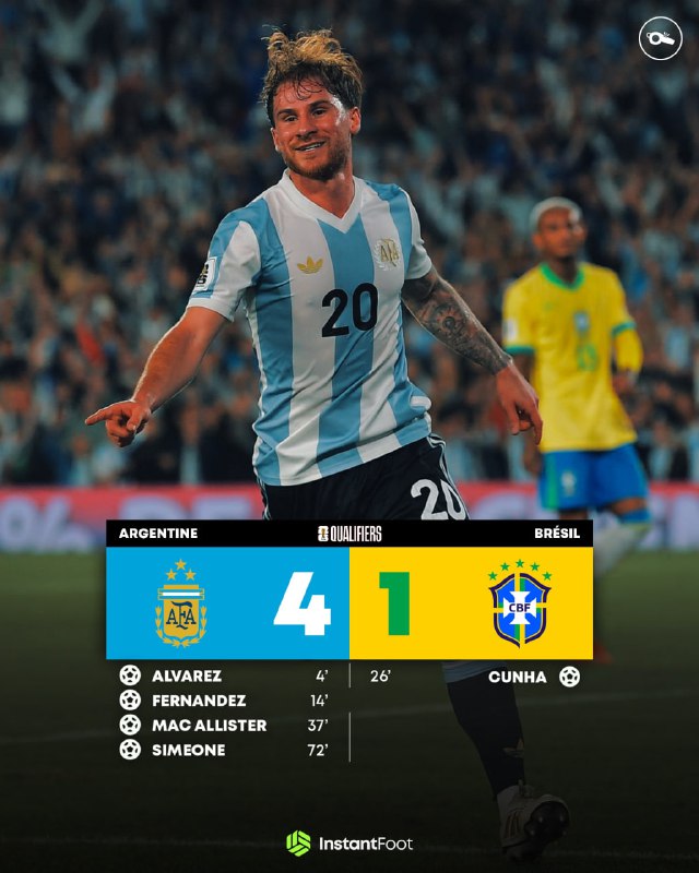 🇦🇷❌🇧🇷 — ⚽️ In a clash that will go down in South American football history, Brazil was defeated by Argentina 4-1 at the Monumental de Núñez. This result, which occurred in the 14th round of the qualifiers, marks the first…