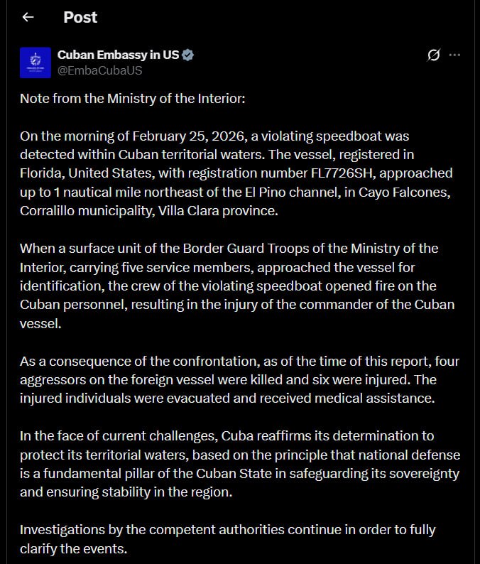 🇨🇺❌🇺🇸 — Cuban Embassy in United States claims that ‘crew of the speedboat opened fire’ on Cuban Coast Guard personnel, leading to the Cuban sailors, reportedly, firing back and killing them during the reported clash: On the morning of February…