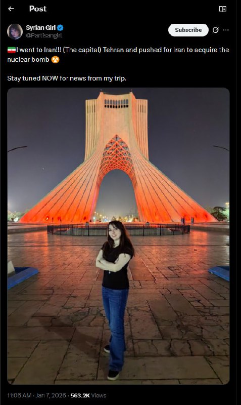 🇸🇾🤝🇮🇷🇮🇷 — Syrian Social Nationalist Party (SSNP) member and Assad Loyalist activist Maram Susli (aka Mimi al-Laham/SyrianPartisangirl) announces she went to Tehran, posing for photos without a Hijab next to Shahyad Tower in Tehran ☢️ According to her, her trip…
