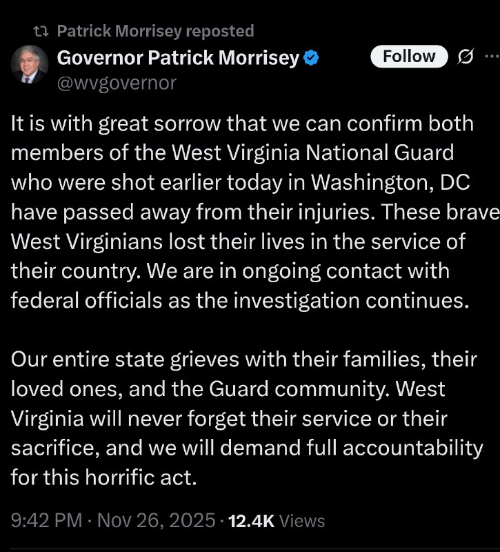 #BREAKING | West Virginia Gov. Patrick Morrisey confirms both National Guard members shot earlier today near the White House in Washington, DC, have succumbed to their injuries. The Global Eye | Subscribe View Source