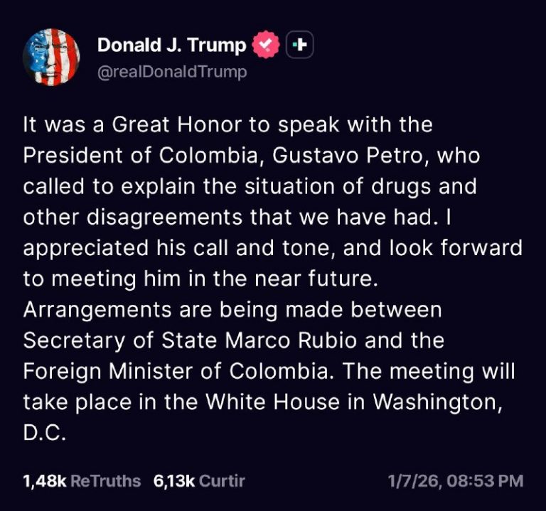 🇺🇸💬📞🇨🇴 — 🇺🇸 President of United States Donald J. Trump on 🌐: “It was a Great Honor to speak with the President of Colombia, Gustavo Petro, who called to explain the situation of drugs and other disagreements that we have…