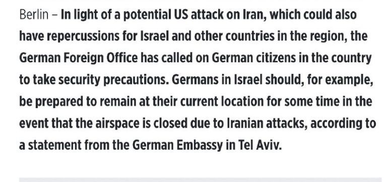 JUST IN: Germany’s Foreign Office is urging its citizens in Israel to be ready for possible airspace shutdowns and extended stays where they are, citing the risk of military escalation involving the U.S., Israel, and Iran. 🔥 WHATSAPP CHANNEL 🔗…
