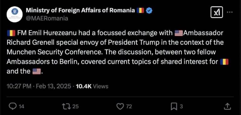 — Another anecdote regarding the professionalism and skill of the Johannis appointed foreign minister of Romania, Emil Hurezeanu: The MFA said he had a “discussion” with Trump’s envoy for the Russo-Ukrainian war, Richard Grenell, talking about “shared interests”, meanwhile Grenell…