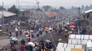 🇨🇩❌🇨🇩 Apocalyptic scenes from earlier today in Goma as hundreds of thousands of people are forced to flee from the city, desperate to escape from the advancing Rwanda-backed M23 fighters Many of the people have been on the run for…