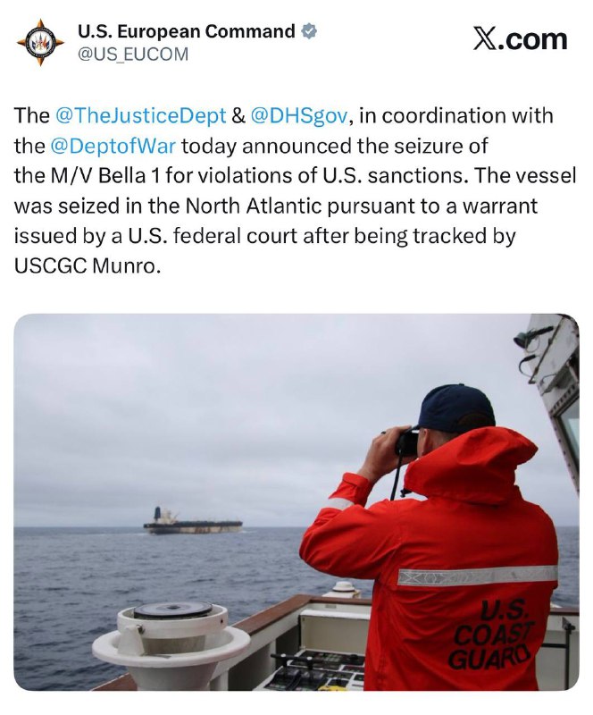 🇺🇸❌🇷🇺 — The U.S. European Command has announced the seizure of the Russian-flagged vessel Bella 1 in the North Atlantic Ocean View Source