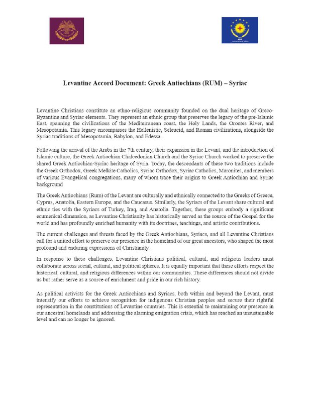 🇸🇾 🇬🇷 – Antiochian Greek Organization and Bethnahrin National Council issue public call for unity across Greek, Syriac, Maronite & Evangelical communities to preserve Christianity in the Levant. View Source