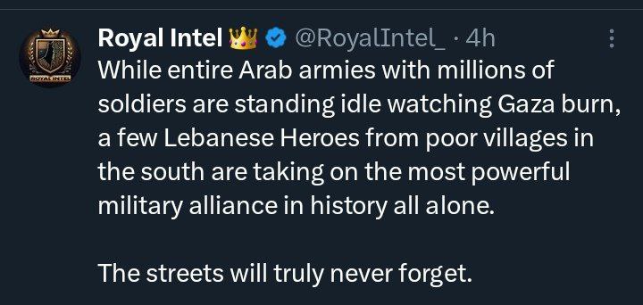 Royal Intel on X: While entire Arab armies with millions of soldiers are standing idle watching Gaza burn, a few Lebanese Heroes from poor villages in the south are taking on the most powerful military alliance in history all alone.…