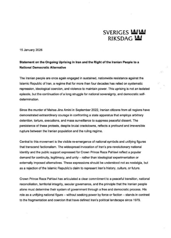 🇸🇪🤝👑👑 — Twelve Swedish parliament members from the Swedish Government’s Coalition parties have jointly expressed their support for the National Revolution of Iran and Prince Reza Pahlavi. View Source