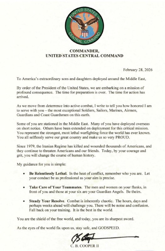 🇺🇸🇺🇸❌🇮🇷 — A Letter that was issued by United States Central Command (CENTCOM) Commander, Adm. Brad Cooper, to American servicemembers across the Middle East on February 28, 2026, prior to the start of strikes against the Islamic Republic of Iran…