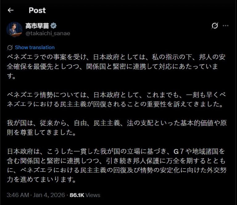 🇯🇵🤝🇻🇪🗽 — Japanese Prime-Minister Sanae Takaichi orders the Japanese Foreign Ministry to review the safety of Japanese citizens in Venezuela and that from now on Japan will support the efforts to restore Democracy in Venezuela: In response to the incident…