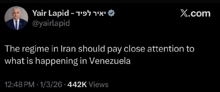 👀 NOTABLE STATEMENT… Israeli Opposition Leader Yair Lapid posts ominous message to Iran’s leadership following the American capture of Venezuelan President Maduro. 🇺🇸 WHATSAPP GROUP 🔗 🇮🇱 TELEGRAM 🔗 🔥 WHATSAPP CHANNEL 🔗 🔗 FOLLOW ALL JBN…