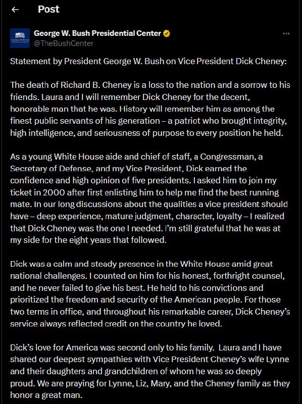 🇺🇸⚰️❗️ — Mr Dick Cheney, the 46th vice president of U.S. under President George W Bush Jr., has passed away aged 84. ➡️ Mr. Cheney, America’s most powerful modern vice president and chief architect of the “war on terror,” who…