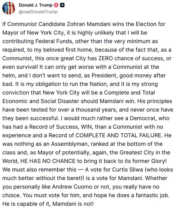 🇺🇸🗳🇺🇸 POTUS: “If Communist Candidate Zohran Mamdani wins the Election for Mayor of New York City, it is highly unlikely that I will be contributing Federal Funds, other than the very minimum as required, to my beloved first home, because…