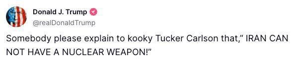 🇺🇸🇮🇱🇮🇷Trump called his longtime supporter, journalist Tucker Carlson, “crazy” after he criticized him for threatening to drag the country into war with Iran. “Someone please explain to the crazy Tucker Carlson that Iran can’t have nukes,” Trump wrote on Truth…