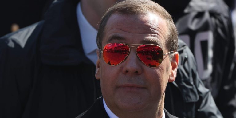 Angle down icon An icon in the shape of an angle pointing down. Russian Security Council Deputy Chairman Dmitry Medvedev wearing sunglasses arrives to the Victory Day Red Square Parade on May 9, 2023 in Moscow, Russia. Contributor/Getty Images Dmitry…