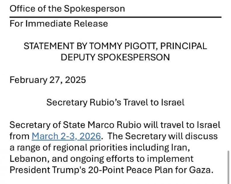 🇮🇱🇺🇸US Secretary of State Marco Rubio is expected to visit Israel on March 2-3 to discuss developments regarding Iran, Lebanon, and Gaza. View Source