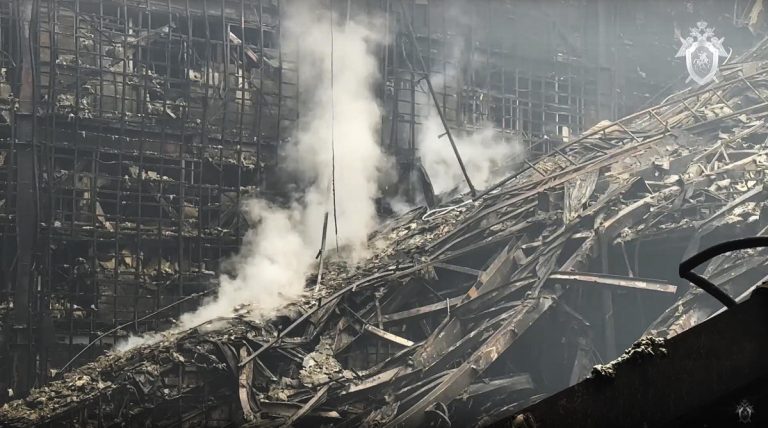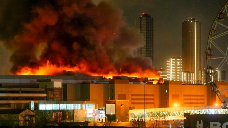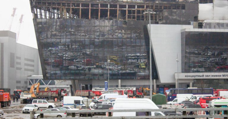 MOSCOW (AP) — The suburban Moscow music hall where gunmen opened fire on concertgoers was a blackened, smoldering ruin Saturday as the death toll in the attack surpassed 130 and Russian authorities arrested four suspects. President Vladimir Putin claimed they…