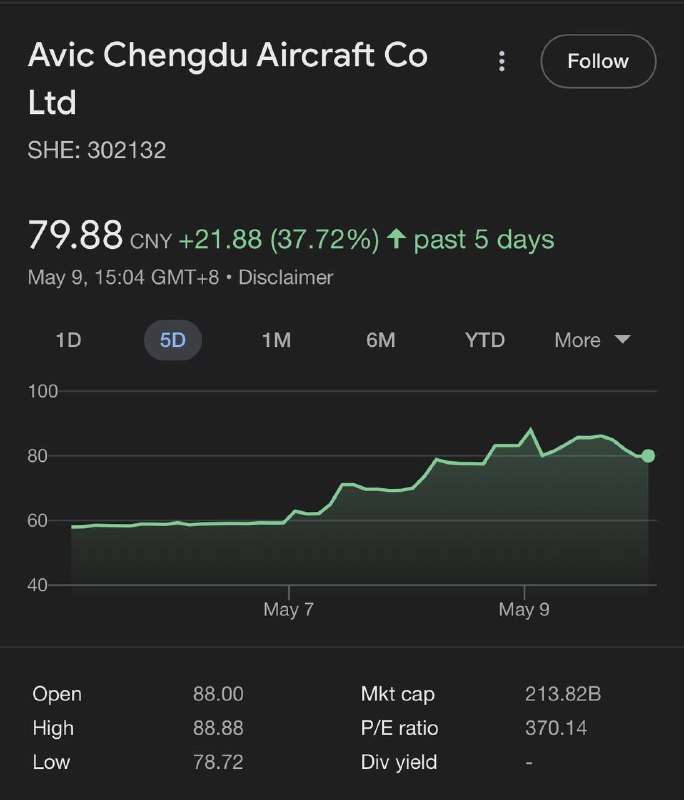Shares of China’s AVIC Chengdu Aircraft jumped about 40% this week after Pakistan claimed its J-10C jets shot down Indian warplanes, including a French-made Rafale. View Source