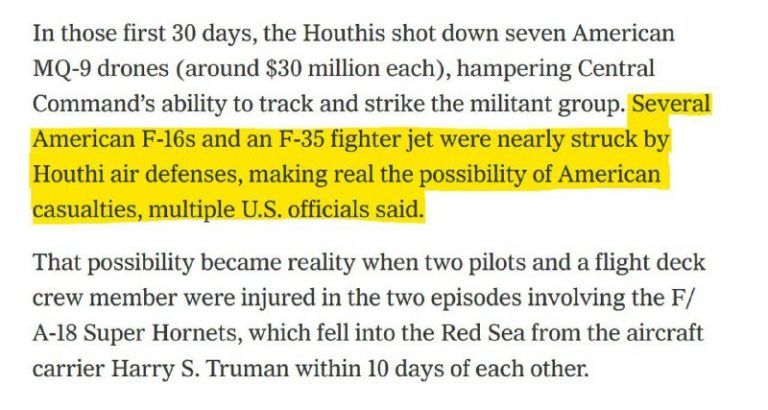 🚨🇺🇸🇾🇪 NYT: Several American F-16s and an F-35 fighter jet were nearly struck by Houthi air defenses In an explosive report, the New York Times has revealed President Trump ordered the end of the Anti-Houthi campaign as a result of…