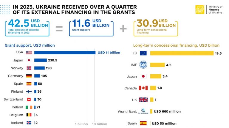 Infographic: Ministry of Finance of Ukraine Ukraine has received external financing totalling US$42.5 billion in 2023, of which US$11.6 billion (27%) was non-repayable grant aid. Source: Ministry of Finance of Ukraine Details: Grant aid was provided by the following countries:…
