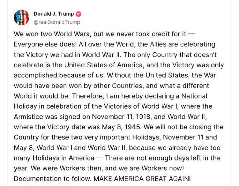 🇺🇸Trump again wrote that the United States won World War II. “We won two World Wars, but we never take credit for it – everyone else does! All over the world, the Allies are celebrating the victory we won in…