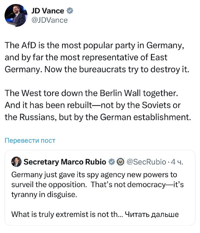 🇺🇸🇩🇪US Vice President J.D. Vance, following Secretary of State Marco Rubio and Elon Musk, criticized Germany’s decision to recognize the Alternative for Germany party as far-right. The US vice president said that the AfD is “the most popular party in…