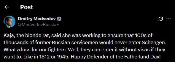 🇷🇺🇪🇺Medvedev: The blonde rat Kaja said that she is working to ensure that hundreds of thousands of former Russian servicemen never make it to the Schengen zone. What a loss for our soldiers. Well, they can enter there without visas…