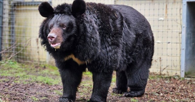 LONDON (AP) — An unlikely refugee from the war in Ukraine — a rare Asiatic black bear — arrived at his new home in Scotland on Friday and quickly took to a meal of cucumbers and watermelon. The 12-year-old Yampil…