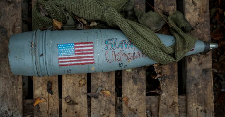 [1/3]A shell with a painted American flag appears side of a Giatsint-B howitzer at a position near a frontline, amid Russia’s attack on Ukraine, at an undisclosed location in Donetsk region, Ukraine, November 4, 2023. REUTERS/Alina Smutko TPX IMAGES OF…