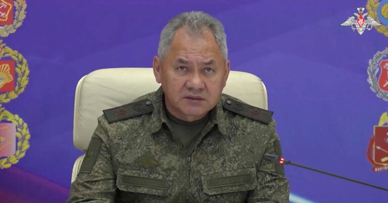 Russian Defence Minister Sergei Shoigu attends a meeting with the commanders of troops fighting in Ukraine, at an unknown location, in this still image from video released October 5, 2023. Russian Defence Ministry/Handout via REUTERS/File Photo Acquire Licensing Rights Oct…