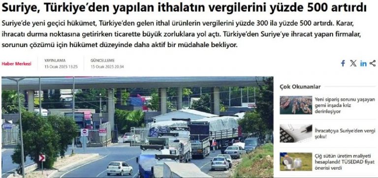 🇹🇷🇸🇾The interim government of Syria, which was considered “pro-Turkish” by many observers, introduced a 300-500% increase in customs duties on goods from Turkey, which practically stopped exports. The Turkish business newspaper Ekonomim writes about this. This has caused serious problems…