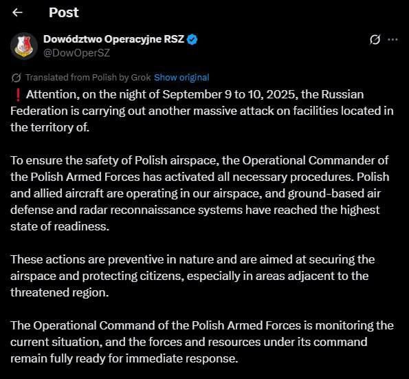🇷🇺🇺🇦🇵🇱Operational Command of the Armed Forces of Poland: To ensure the security of Polish airspace, the Operational Commander of the Armed Forces of Poland has activated all necessary procedures. Polish and allied aircraft are operating in our airspace, and ground…