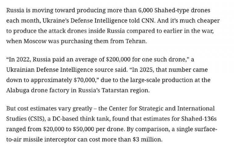 🇷🇺🇺🇦Russia is moving towards producing more than 6,000 “Shaheds” each month, CNN was informed by the Main Intelligence Directorate of the Ukrainian Ministry of Defense. Their production inside Russia is much cheaper compared to the beginning of the war, when…
