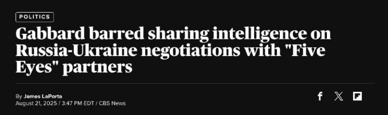 🇺🇸🇷🇺🇺🇦The US has classified intelligence about negotiations on Ukraine from London and other allies, CBS News reports citing sources. National Intelligence Director Tulsi Gabbard issued a directive to intelligence officers on July 20, ordering that all information about Russian-Ukrainian negotiations…