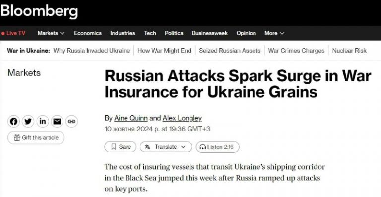 🇷🇺🇺🇦The cost of insuring ships passing through Ukrainian seaports in the Black Sea has risen sharply in a week due to Russian attacks, Bloomberg reports. The cost of insurance has risen to more than 1% of the value of the…