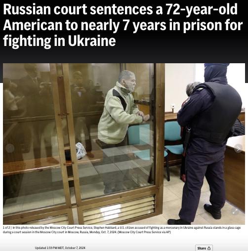 MOSCOW (AP) — A Russian court on Monday sentenced a 72-year-old American in a closed trial to nearly seven years in prison for allegedly fighting as a mercenary in Ukraine. Prosecutors said Stephen Hubbard signed a contract with the Ukrainian…