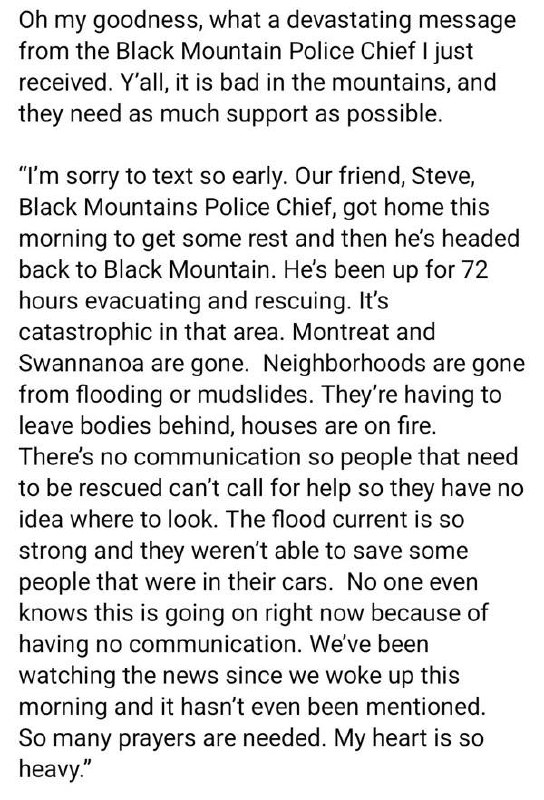 🇺🇸⛑️ Black Mountain Police Chief has broken the silence that has plagued Western NC after historic flooding from Hurricane Helene: “It’s catastrophic in that area. Towns are gone. Neighborhoods are gone. We have had to leave bodies behind. Homes are…