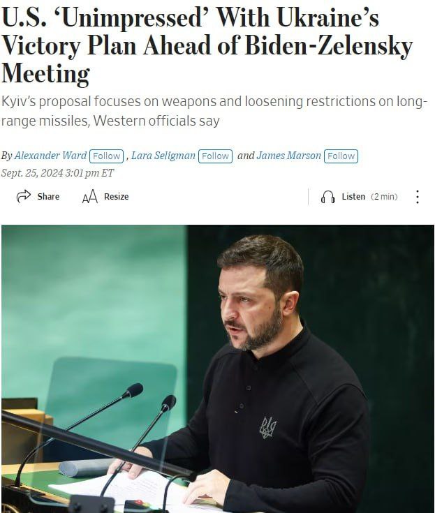 🇺🇸🇺🇦The US is “not impressed” with Ukraine’s “win plan” ahead of the Biden-Zelensky meeting, The Wall Street Journal writes. According to the publication, the Biden administration is concerned that the Ukrainian president’s plan to win a military conflict against Russia…