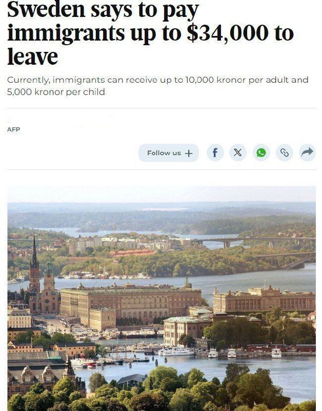 🇸🇪In Sweden, migrants who have received citizenship will be offered $34,000 if they voluntarily leave for the country from which they came . The measure will come into effect in 2026, the current amount is $960. To receive the money,…