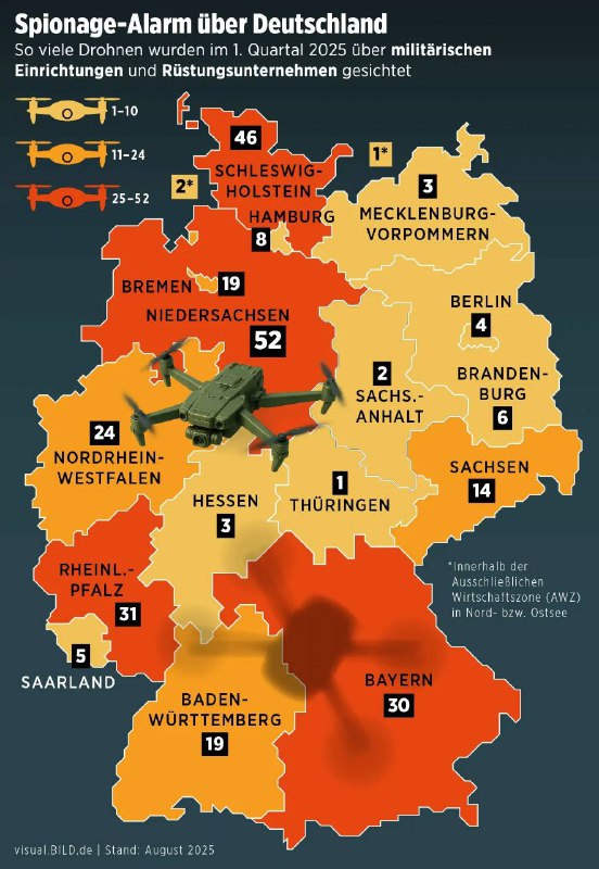 🇩🇪According to Bild, between January and March, 536 unknown reconnaissance UAVs were detected over Germany, conducting surveillance on military and critical infrastructure. During this period, 270 incidents involving 536 drones were recorded, with at least 55 cases involving the simultaneous…