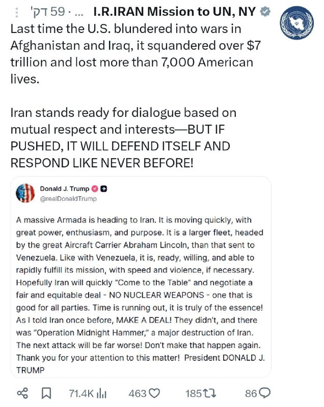 🇮🇷🇺🇸Iran responds to Trump’s recent threat: The last time the US got involved in wars in Afghanistan and Iraq, it spent more than $7 trillion and lost more than 7,000 of its people. Iran is ready for dialogue based on…